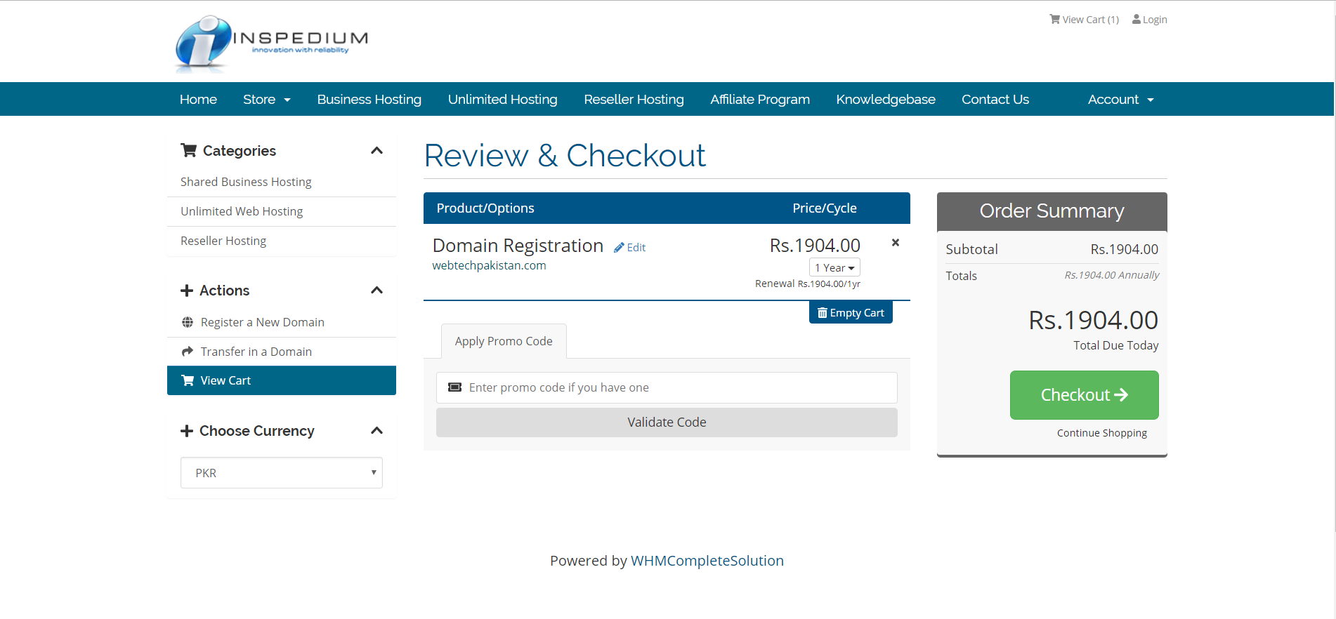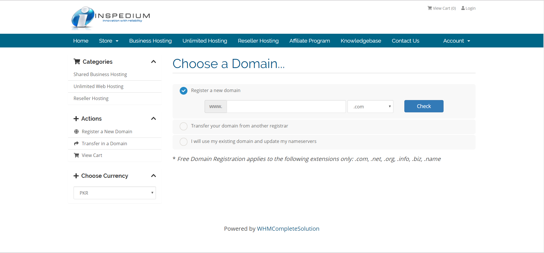 Here you enter the domain name you want and check if it is available, if yes click continue , if no then either repeat the check process with some other domain name or else just add a domain name from the list of suggested domain names that pops up to ‘the cart’ and then click continue.Another thing, you can choose the currency in which you want to pay from the option in the right panel. There are two available currency options i.e. 1) Pakistani Rupees , 2) United States Dollar.